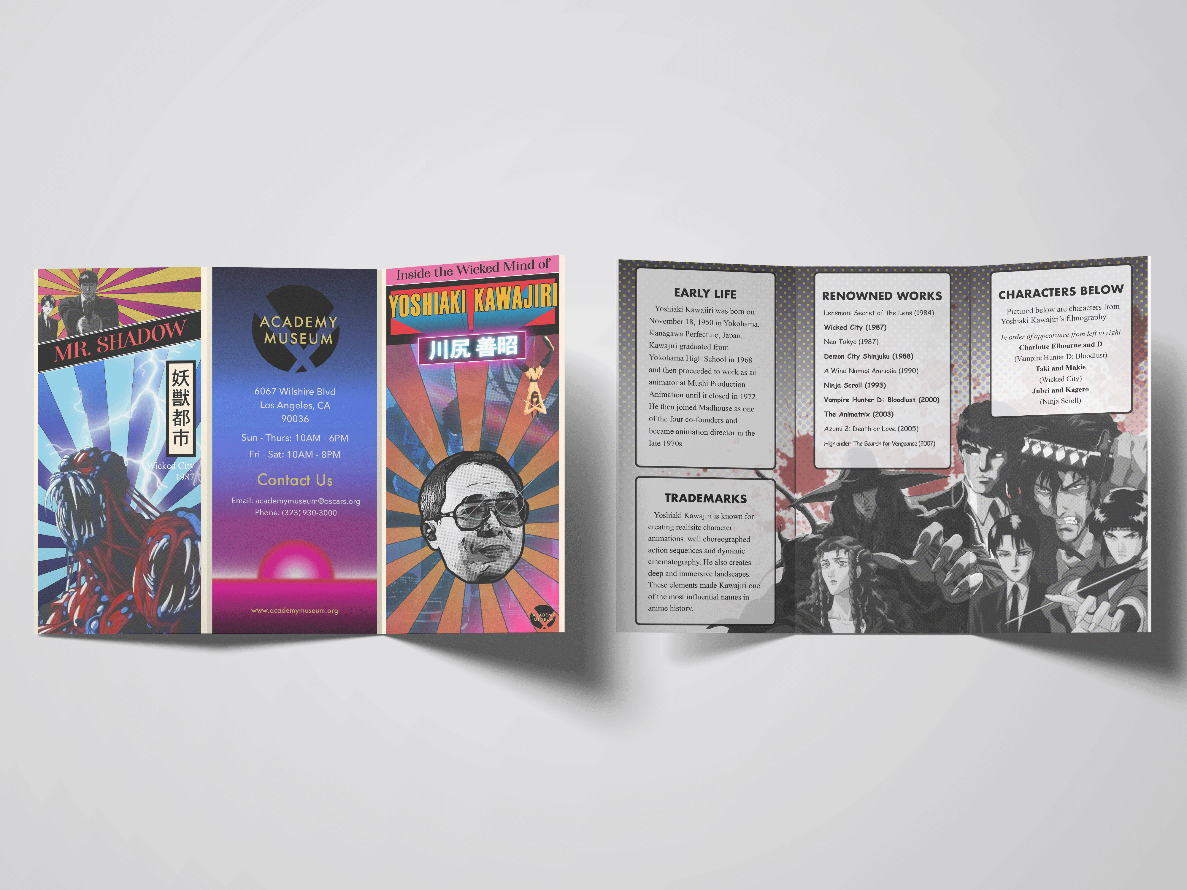 We were tasked to create multiple branding elements to promote an artist of our choice at a museum that would suit their work. These elements were: a brochure for the exhibit, a poster to advertise the exhibit, and unique merchandise to promote the museum/exhibit. We were also tasked to create a new logo for the museum of our choice. The logo was to be an entirely new design mainly for the museum itself rather than to promote the exhibit of the artist. For this project, I chose anime director Yoshiaki Kawajiri as my artist and The Academy Musuem to represent his work.